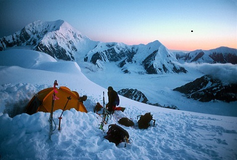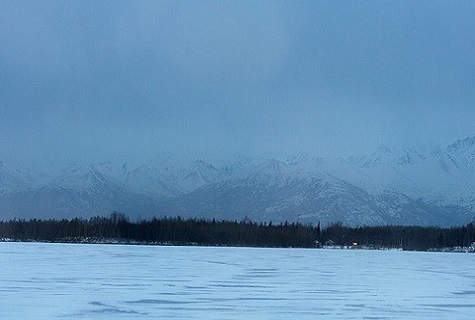 This is a frozen lake in Wasilla where the Zeilers play ice hockey in the famed blue winter twilight of Alaska.