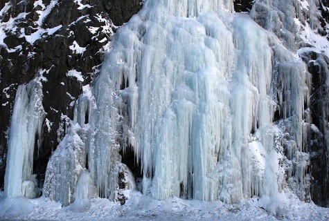 The Zeilers rappel down a frozen waterfall during a light snowfall.