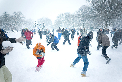 The Zeiler children and Athena have an epic snowball fight behind their log cabin.